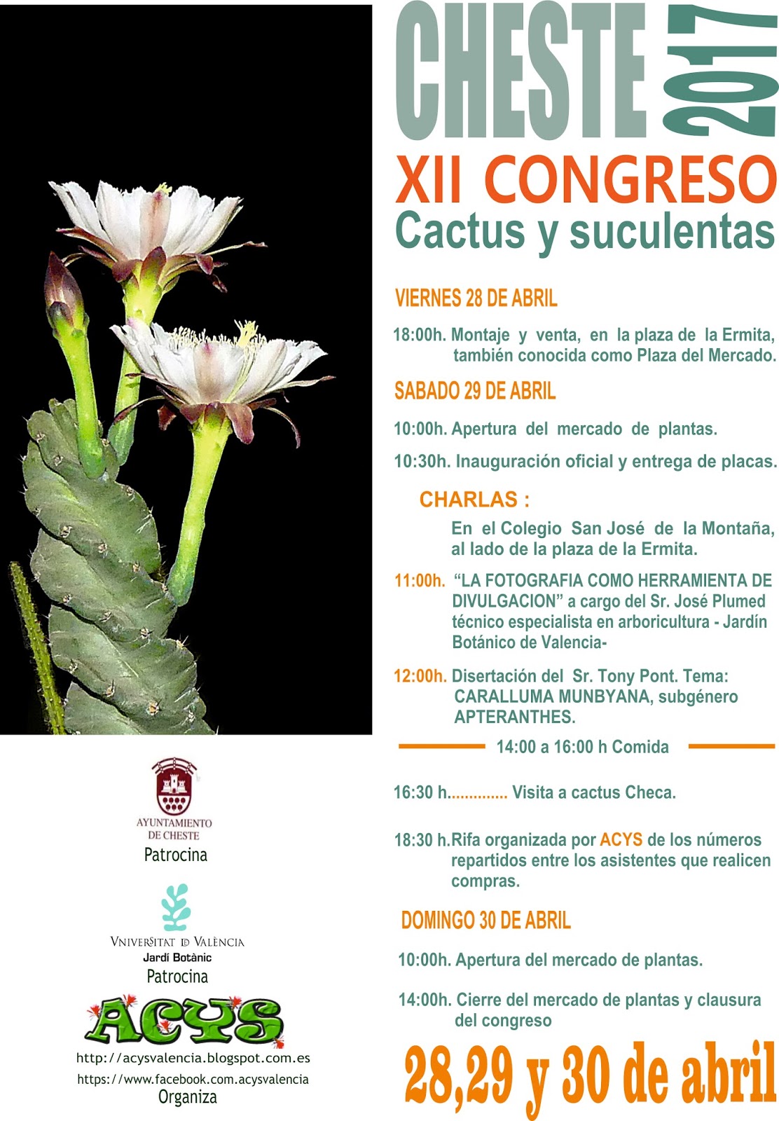 Us informem que aquest any el Congrés de Cactus i Suculentes que té lloc a Xest se celebrarà el cap de setmana del 29 i 30 d’abril. Des d’ASAC no organitzarem una sortida conjunta, però us animem a anar-hi ja que sempre és una trobada interessant. Hi haurà xerrades sobre plantes i també venda. Podeu trobar més informació a la web d’ACYS: http://acysvalencia.blogspot.com. Si us animeu a anar-hi i voleu participar en el dinar de germanor el dissabte, us heu d’apuntar abans del 15 d’abril.