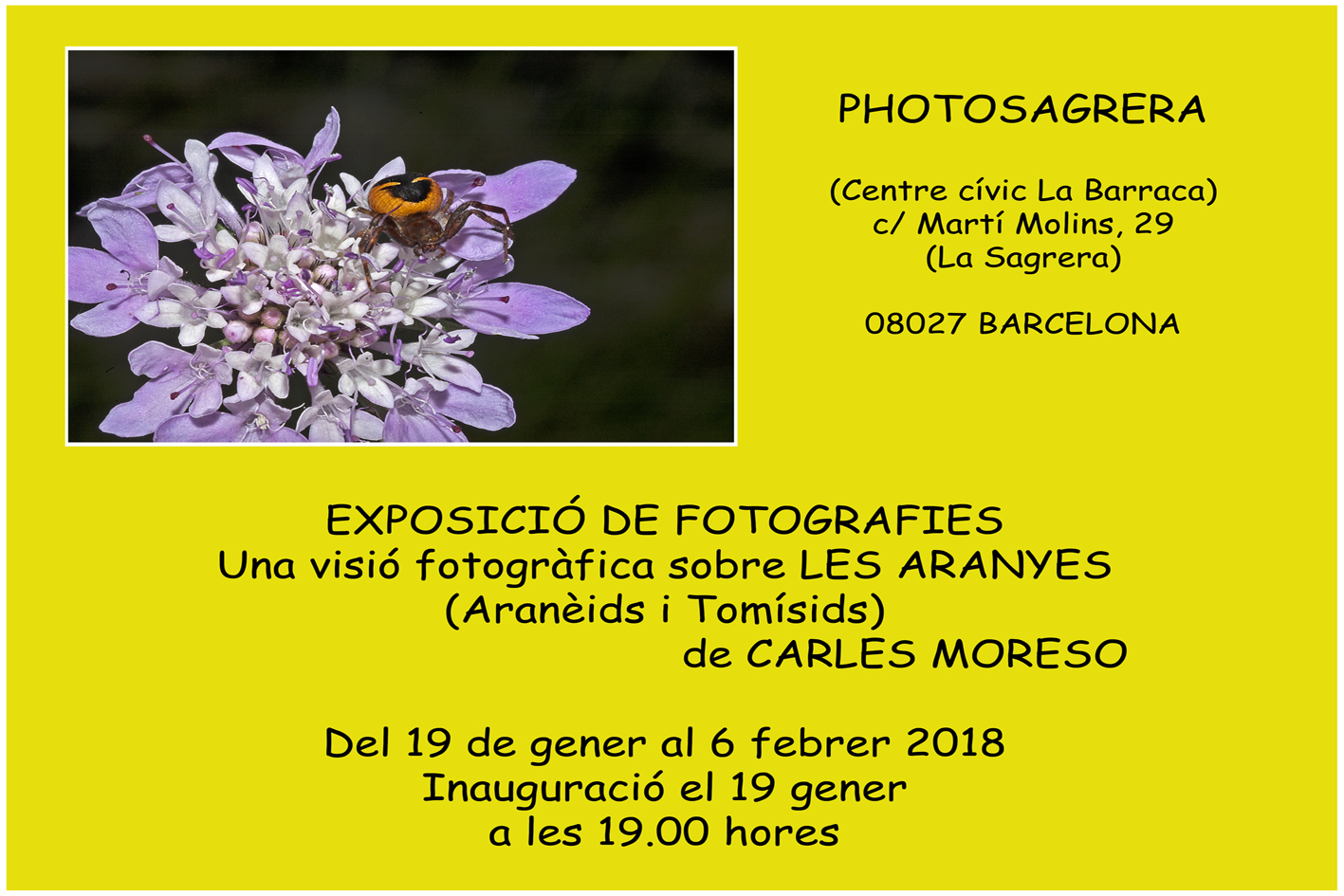Com sabeu, el nostre soci Carles Moreso és una gran fotògraf. Aquests dies hi ha una exposició de les seves fotos d’aranyes. Molt diferent de cactus però segurament qui s’interessa per cactus també s’interessa per altres parts de la VIDA del nostre planeta. N’hi ha unes 45700 espècies i daten des de fa 318 milions d’anys!